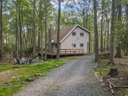 Cozy chalet in the highly sought-after Locust Lake Village community. This home underwent a complete gut renovation in 2022 and blends rustic charm with modern upgrades. Soaring vaulted ceilings with exposed beams create an open, airy feel, while wood cabinetry, granite countertops, and stainless steel GE appliances add a touch of elegance to the kitchen. Oak hardwood floors throughout, two new bathrooms with stone flooring. Upgrades include Hype Heat Mitsubishi split units, 220 new electric in metal casements, PEX plumbing, and spray foam insulation (2021). In 2023, replaced stone exterior around the fireplace and a new roof. Most recently, in 2025, the home received new double-pane windows/moldings, and sill plates—making it as energy-efficient as it is beautiful.