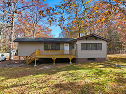 Move in ready and already updated. This 3 bedroom, 1 bath home was renovated from top to bottom with new roof, newer siding, a brand new kitchen, updated bath and durable LVP flooring. The main level feels open and bright with vaulted ceilings, exposed beams and big windows that look out to the trees. The white kitchen has granite counters and plenty of cabinet space so everyday cooking is easy. There are two bedrooms on this floor and both have cedar closets. The finished walk out lower level is the extra space everyone wants. It has a cozy wood paneled family room, a wood stove for winter, a built in bar and a slider to the yard. The third bedroom is down here too, so it works well as a guest room or home office and it also has a cedar closet. Outside you get a large front deck for coffee, relaxing and enjoying the setting. The lot feels natural and low maintenance. Neutral finishes inside make it simple to furnish and enjoy right away. Some photos are virtually staged to show how the rooms can be set up. If you have been looking for an updated home with character and a finished walk out lower level, put this one on your list.